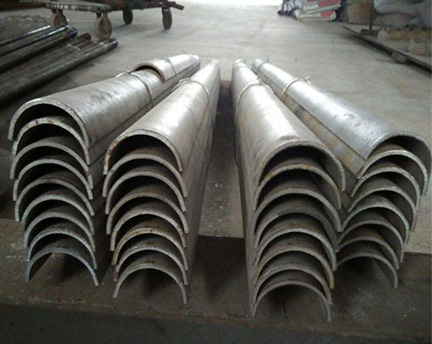 耐磨磚的斷面形狀大多為半圓形(180度) ,也有120-160度,主要用于帶翅片的管子(水墻) ; 耐磨磚分為直型耐磨磚、內彎耐磨磚、外彎耐磨磚、側彎耐磨磚、 S 彎耐磨磚等。直紋抗磨瓦長度在20mm-3000mm 范圍內,一般長度1000-2000mm 較為常用,并且在繪圖上參數(shù)如下: 所用管道外徑、所用管道彎曲半徑 r (到管道中心)、彎曲角度和耐磨瓦兩側弧形直截面長度。